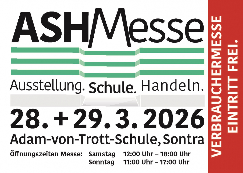 Auch in diesem Jahr sind wir wieder auf der ASH-Verbrauchermesse in Sontra vertreten. Die Messe findet am 28. und 29. März 2026 in der Adam-von-Trott-Schule statt.